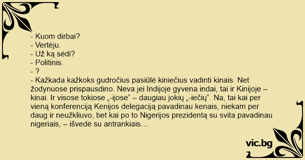 - Kažkada kažkoks gudročius pasiūlė kiniečius vadinti kinais. Net žodynuose prispausdino. Neva jei Indijoje gyvena indai, tai ir Kinijoje – kinai. Ir visose tokiose „-ijose“ – daugiau jokių „-iečių“. Na, tai kai per vieną konferenciją Kenijos delegaciją pavadinau kenais, niekam per daug ir neužkliuvo, bet kai po to Nigerijos prezidentą su svita pavadinau nigeriais, – išvedė su antrankiais…