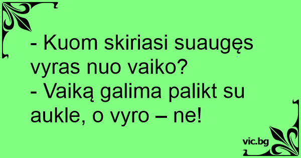 - Kuom skiriasi suaugęs vyras nuo vaiko?- Vaiką galima palikt su aukle, o vyro – ne! 7 0 0 Juokai apie šeimą