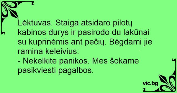 Lėktuvas. Staiga atsidaro pilotų kabinos durys ir pasirodo du lakūnai su kuprinėmis ant pečių. Bėgdami jie ramina keleivius: