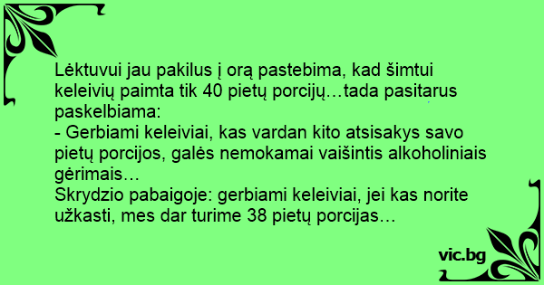 Lėktuvui jau pakilus į orą pastebima, kad šimtui keleivių paimta tik 40 pietų porcijų…tada pasitarus paskelbiama: