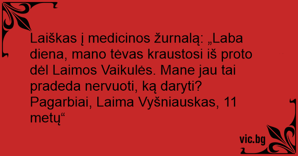 Laiškas į medicinos žurnalą: „Laba diena, mano tėvas kraustosi iš proto dėl Laimos Vaikulės. Mane jau tai pradeda nervuoti, ką daryti? Pagarbiai, Laima Vyšniauskas, 11 metų“