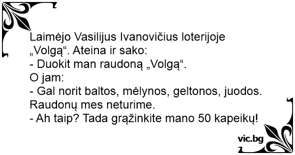 Laimėjo Vasilijus Ivanovičius loterijoje „Volgą“. Ateina ir sako: