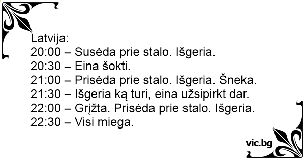 21:30 – Išgeria ką turi, eina užsipirkt dar.