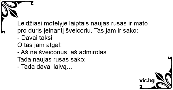 Leidžiasi motelyje laiptais naujas rusas ir mato pro duris įeinantį šveicoriu. Tas jam ir sako: