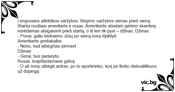 - O aš noriu atbėgti antras, po to sportininko, kurį po finišo diskvalifikuos už dopingą.