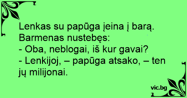 Lenkas su papūga įeina į barą. Barmenas nustebęs: