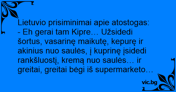 - Eh gerai tam Kipre… Užsidedi šortus, vasarinę maikutę, kepurę ir akinius nuo saulės, į kuprinę įsidedi rankšluostį, kremą nuo saulės… ir greitai, greitai bėgi iš supermarketo…