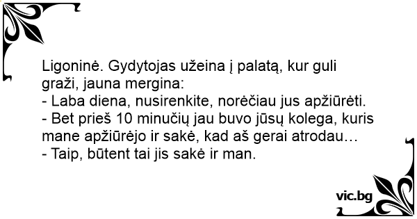 - Bet prieš 10 minučių jau buvo jūsų kolega, kuris mane apžiūrėjo ir sakė, kad aš gerai atrodau…