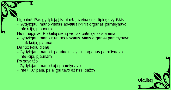 Ligoninė. Pas gydytoją į kabinetą užeina susirūpinęs vyriškis. - Gydytojau, mano vienas apvalus lytinis organas pamėlynavo. - Infekcija, pjaunam. Nu ir nupjovė. Po kelių dienų vėl tas pats vyriškis ateina. - Gydytojau, mano ir antras apvalus lytinis organas pamėlynavo. …-Infekcija, pjaunam. Dar po kelių dienų. - Gydytojau, mano ir pagrindinis lytinis organas pamėlynavo. - Infekcija, pjaunam. Po savaitės. - Gydytojau, mano koja pamėlynavo. - Infek…O pala, pala, gal tavo džinsai dažo?