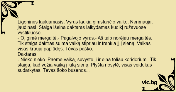 - O, gimė mergaitė.- Pagalvojo vyras.- Aš taip norėjau mergaitės. Tik staiga daktras suima vaiką stipriau ir trenkia jį į sieną. Vaikas visas kraujų paplūdęs. Tėvas paško.