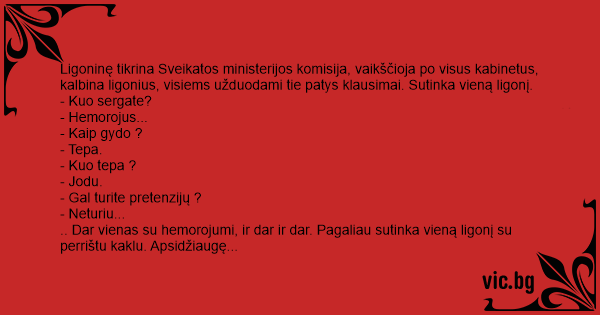 .. Dar vienas su hemorojumi, ir dar ir dar. Pagaliau sutinka vieną ligonį su perrištu kaklu. Apsidžiaugę klausia: