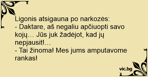 - Daktare, aš negaliu apčiuopti savo kojų… Jūs juk žadėjot, kad jų nepjausit!…
