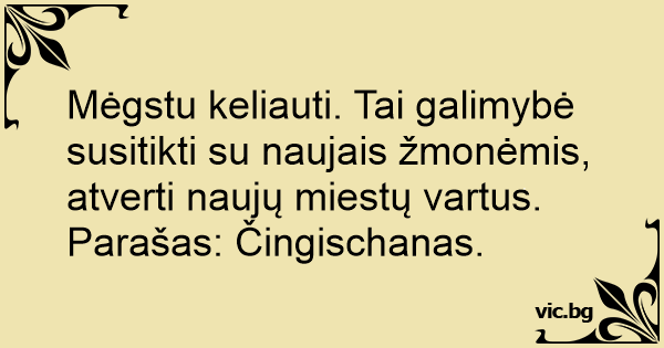 Mėgstu keliauti. Tai galimybė susitikti su naujais žmonėmis, atverti naujų miestų vartus. Parašas: Čingischanas.