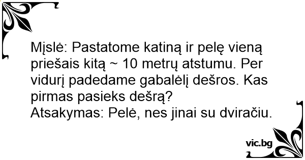 Mįslė: Pastatome katiną ir pelę vieną priešais kitą ~ 10 metrų atstumu. Per vidurį padedame gabalėlį dešros. Kas pirmas pasieks dešrą? Atsakymas: Pelė, nes jinai su dviračiu.