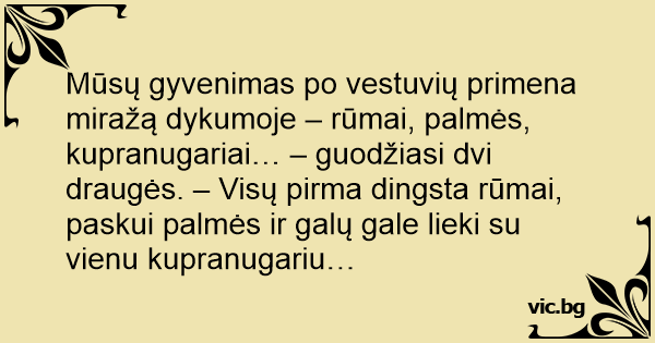 Mūsų gyvenimas po vestuvių primena miražą dykumoje – rūmai, palmės, kupranugariai… – guodžiasi dvi draugės. – Visų pirma dingsta rūmai, paskui palmės ir galų gale lieki su vienu kupranugariu…