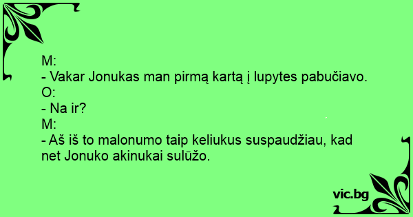 - Aš iš to malonumo taip keliukus suspaudžiau, kad net Jonuko akinukai sulūžo.