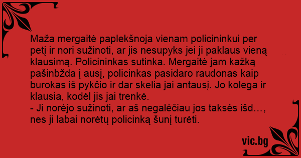 Maža mergaitė paplekšnoja vienam policininkui per petį ir nori sužinoti, ar jis nesupyks jei ji paklaus vieną klausimą. Policininkas sutinka. Mergaitė jam kažką pašinbžda į ausį, policinkas pasidaro raudonas kaip burokas iš pykčio ir dar skelia jai antausį. Jo kolega ir klausia, kodėl jis jai trenkė.