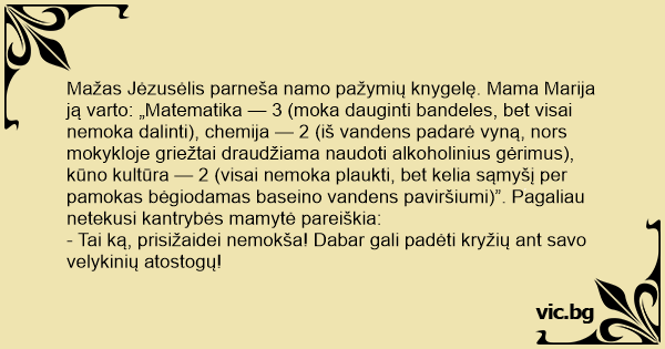 Mažas Jėzusėlis parneša namo pažymių knygelę. Mama Marija ją varto: „Matematika — 3 (moka dauginti bandeles, bet visai nemoka dalinti), chemija — 2 (iš vandens padarė vyną, nors mokykloje griežtai draudžiama naudoti alkoholinius gėrimus), kūno kultūra — 2 (visai nemoka plaukti, bet kelia sąmyšį per pamokas bėgiodamas baseino vandens paviršiumi)”. Pagaliau netekusi kantrybės mamytė pareiškia: