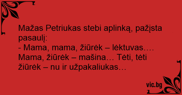 - Mama, mama, žiūrėk – lėktuvas…. Mama, žiūrėk – mašina… Tėti, tėti žiūrėk – nu ir užpakaliukas…
