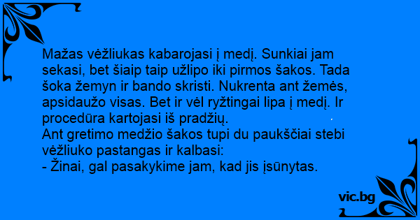 Ant gretimo medžio šakos tupi du paukščiai stebi vėžliuko pastangas ir kalbasi: