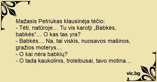 - Tėti, natūroje… Tu vis karotji „Babkės, babkės“… O kas tas yra?