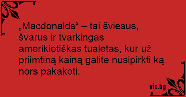 „Macdonalds“ – tai šviesus, švarus ir tvarkingas amerikietiškas tualetas, kur už priimtiną kainą galite nusipirkti ką nors pakakoti.