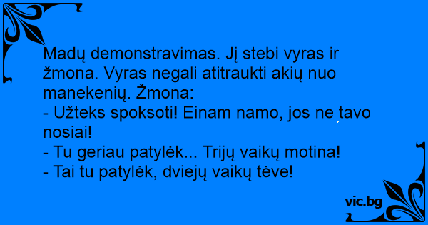 Madų demonstravimas. Jį stebi vyras ir žmona. Vyras negali atitraukti akių nuo manekenių. Žmona:
