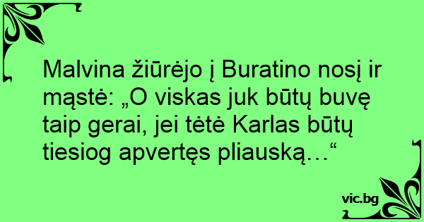 Malvina žiūrėjo į Buratino nosį ir mąstė: „O viskas juk būtų buvę taip gerai, jei tėtė Karlas būtų tiesiog apvertęs pliauską…“