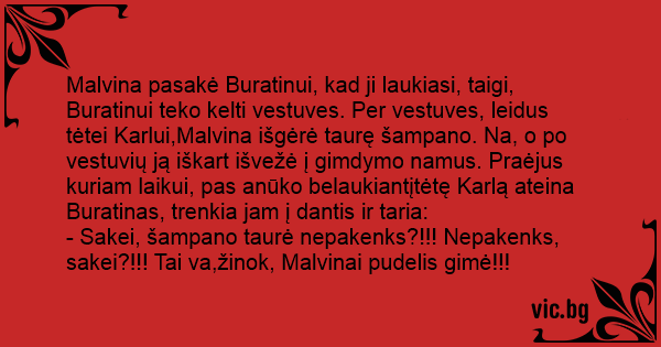 - Sakei, šampano taurė nepakenks?!!! Nepakenks, sakei?!!! Tai va,žinok, Malvinai pudelis gimė!!!