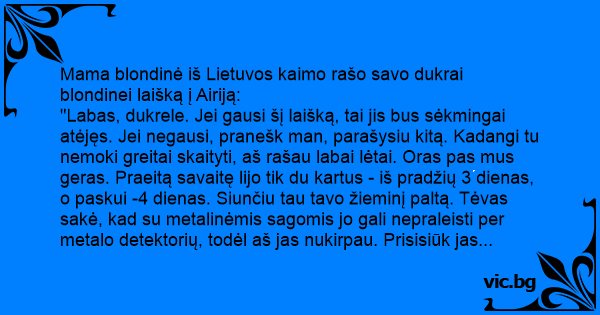 Mama blondinė iš Lietuvos kaimo rašo savo dukrai blondinei laišką į Airiją: