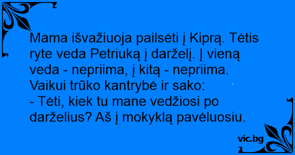 - Tėti, kiek tu mane vedžiosi po darželius? Aš į mokyklą pavėluosiu.