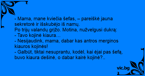 - Mama, mane kviečia šefas, – pareiškė jauna sekretorė ir išskubėjo iš namų.