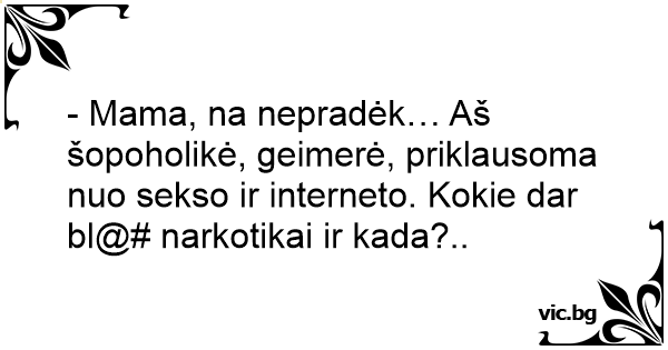 - Mama, na nepradėk… Aš šopoholikė, geimerė, priklausoma nuo sekso ir interneto. Kokie dar bl@# narkotikai ir kada?..