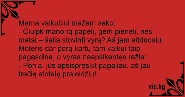 - Čiulpk mano tą papelį, gerk pienelį, nes matai – šalia stovintį vyrą? Aš jam atiduosiu.