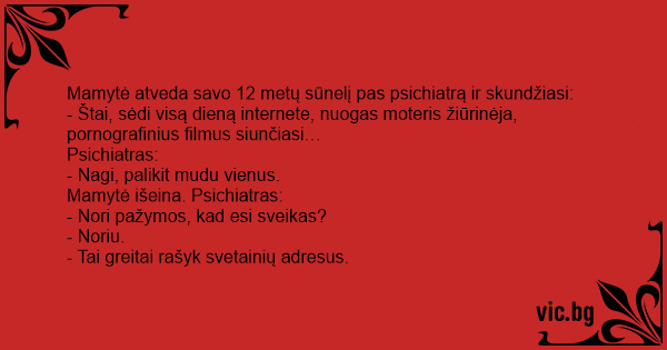 Mamytė atveda savo 12 metų sūnelį pas psichiatrą ir skundžiasi: