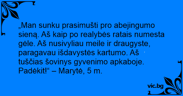 „Man sunku prasimušti pro abejingumo sieną. Aš kaip po realybės ratais numesta gėle. Aš nusivyliau meile ir draugyste, paragavau išdavystės kartumo. Aš tuščias šovinys gyvenimo apkaboje. Padėkit!“ – Marytė, 5 m.