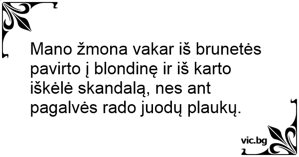 Mano žmona vakar iš brunetės pavirto į blondinę ir iš karto iškėlė skandalą, nes ant pagalvės rado juodų plaukų.