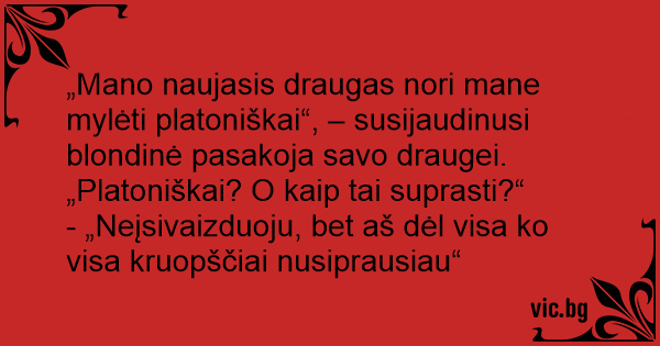 „Mano naujasis draugas nori mane mylėti platoniškai“, – susijaudinusi blondinė pasakoja savo draugei. „Platoniškai? O kaip tai suprasti?“