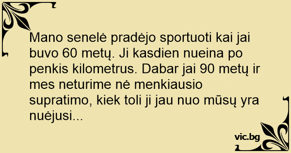 Mano senelė pradėjo sportuoti kai jai buvo 60 metų. Ji kasdien nueina po penkis kilometrus. Dabar jai 90 metų ir mes neturime nė menkiausio supratimo, kiek toli ji jau nuo mūsų yra nuėjusi...