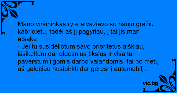 Mano viršininkas ryte atvažiavo su nauju gražiu kabrioletu, todėl aš jį pagyriau, į tai jis man atsakė: