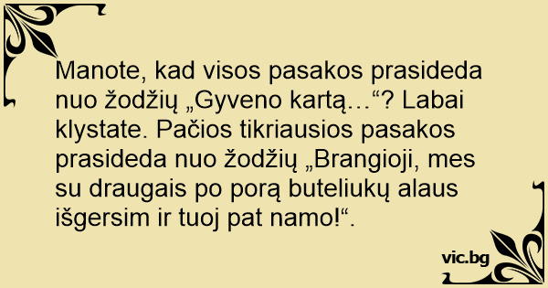 Manote, kad visos pasakos prasideda nuo žodžių „Gyveno kartą…“? Labai klystate. Pačios tikriausios pasakos prasideda nuo žodžių „Brangioji, mes su draugais po porą buteliukų alaus išgersim ir tuoj pat namo!“.