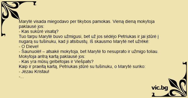 - Šaunuolė! – vėl pagyrė mokytoja, o Marytė ir vėl užmigo. Mokytoja trečią kartą paklausė: