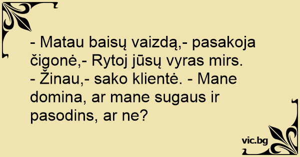 - Matau baisų vaizdą,- pasakoja čigonė,- Rytoj jūsų vyras mirs.