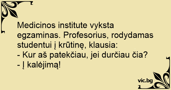 Medicinos institute vyksta egzaminas. Profesorius, rodydamas studentui į krūtinę, klausia: