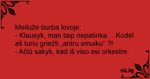 Meilužis barasi su moterimi: - Tu vis kalbi ir kalbi apie savo vyrą. Man nusibodo vis būti antruoju smuiku! - Džiaukis, kad iš viso esi orkestre!