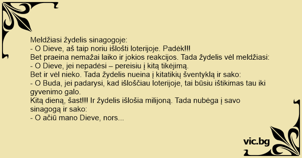 Kitą dieną, šast!!! Ir žydelis išlošia milijoną. Tada nubėga į savo sinagogą ir sako: