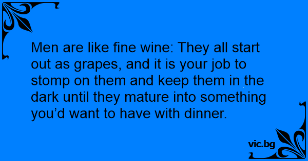 Men are like fine wine: They all start out as grapes, and it is your job to stomp on them and keep them in the dark until they mature into something you’d want to have with dinner.