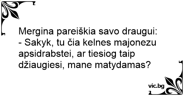 - Sakyk, tu čia kelnes majonezu apsidrabstei, ar tiesiog taip džiaugiesi, mane matydamas?