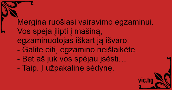Mergina ruošiasi vairavimo egzaminui. Vos spėja įlipti į mašiną, egzaminuotojas iškart ją išvaro: