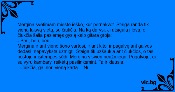Mergina svetimam mieste ieško, kur pernakvot. Staiga randa tik vieną laisvą vietą, su čiukčia. Na ką darysi. Ji atsigula į lovą, o čiukčia šalia pasiėmęs gyslą kaip gitara groja: